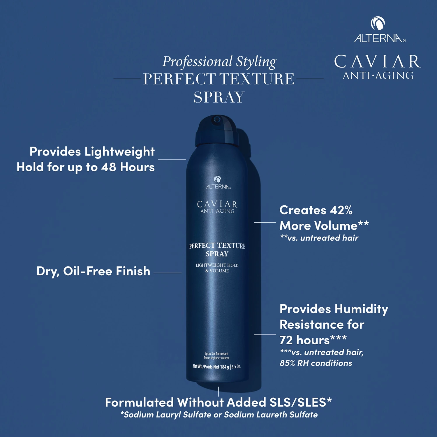 The Alterna Caviar Anti-Aging Professional Styling Perfect Texture Spray is a combination of dry shampoo and finishing spray that helps to give hair touchable texture and fullness. This multipurpose spray is infused with a blend of strengthening proteins and nourishing extracts, such as Panthenol, Keratin, and Biotin, to help fortify each strand helping to add dimensional texture, shape, and movement to all hair types. *packaging may vary, subject to availability*