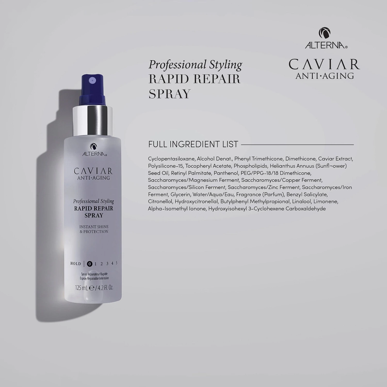 Alterna Caviar Anti-Aging Professional Styling Rapid Repair Spray is a vitamin-packed spray that helps revitalize hair while adding instant shine and moisture. This spray is infused with a blend of strengthening proteins and nourishing extracts, such as caviar extract, vitamin C, and Cytokines, to help smooth the hair shaft and increase shine. This lightweight spray works to help add moisture and shine to hair while helping to increase manageability and protect from heat damage.