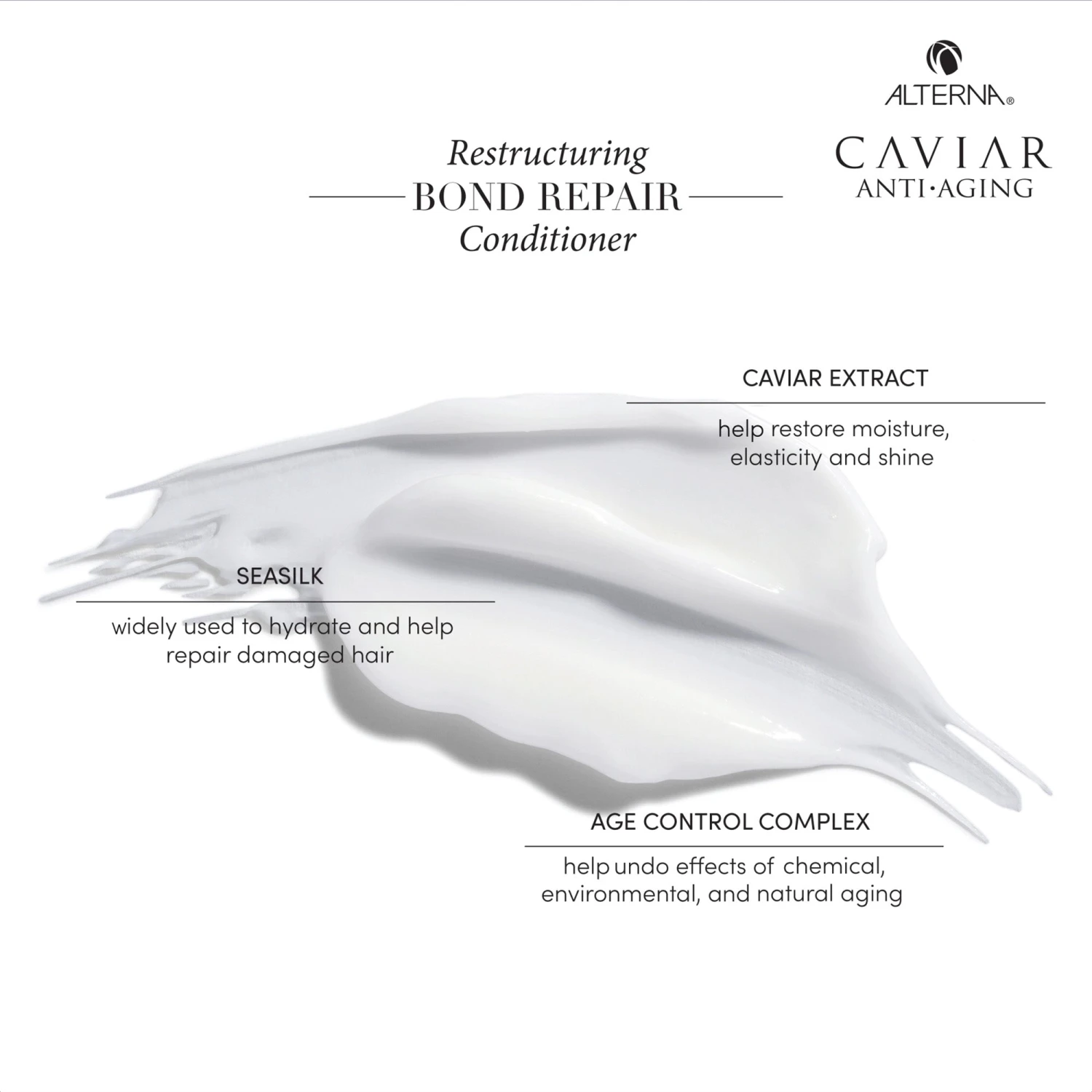 Caviar Anti-Aging Restructuring Bond Repair Conditioner enhances softness and manageability of damaged, brittle hair and helps to combat existing and future damages. This rich formula is infused with potent restorative ingredients to nurture, strengthen and fortify and help prevent breakage and split ends. Caviar Anti-Aging Restructuring Bond Repair Conditioner helps to reduce hair breakage and split ends and is recommended to use as a regimen with the Caviar Anti-Aging Restructuring Bond Repair Shampoo and 3-in-1 Sealing Serum.