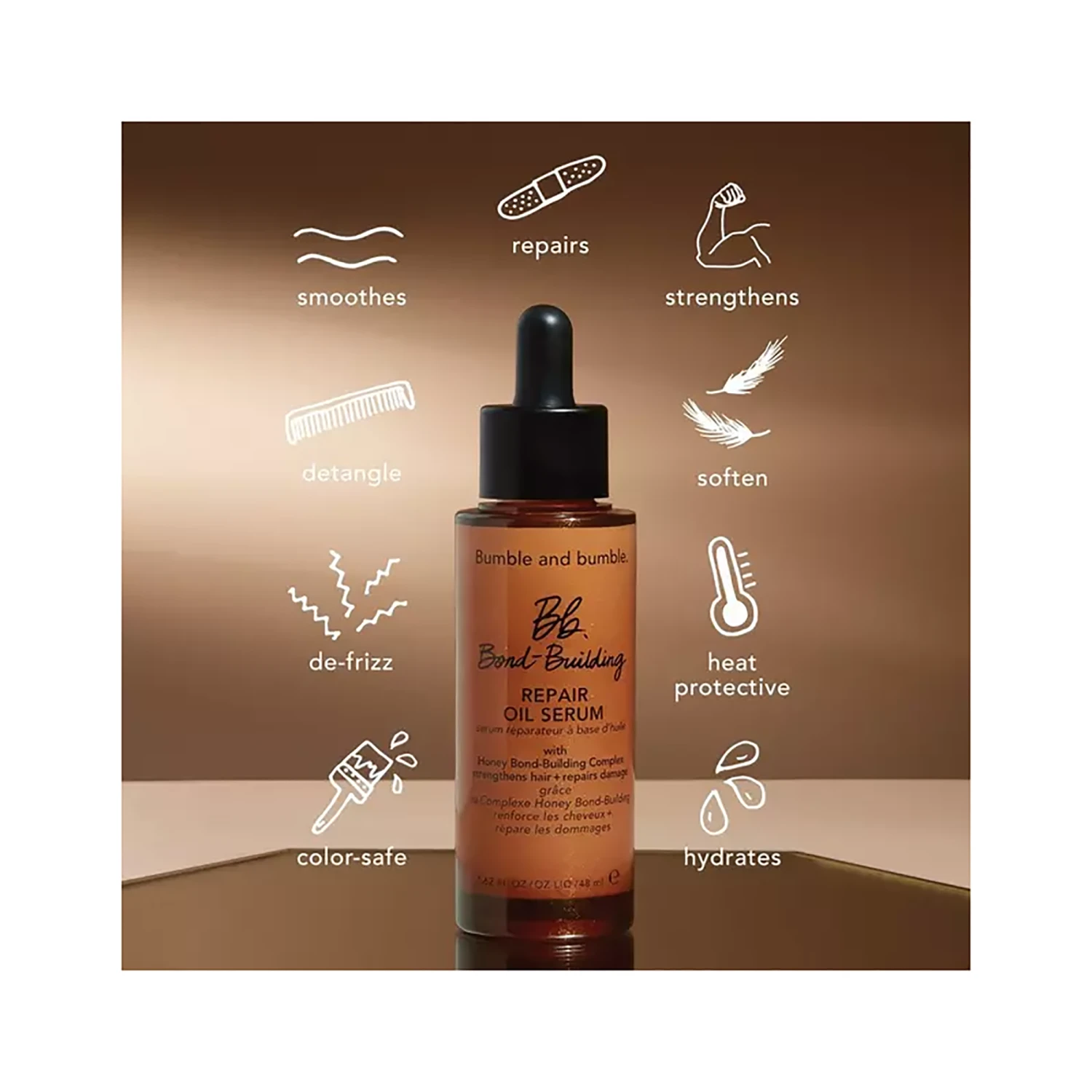 A luxurious, oil-serum leave in that delivers transformative, cortex-to-cuticle to reveal softer, smoother, stronger strands. Powered by Bumble’s highest concentration of Honey Bond-Building Complex, this lightweight treatment-styler hybrid helps reverse the look of damage caused by heat, chemical, and physical styling. Plus, it helps split ends, detangles, reduces frizz, and protects hair against heat tools up to 450°F/232°C. Next-level hair repair for those who style fearlessly (or want to start).
