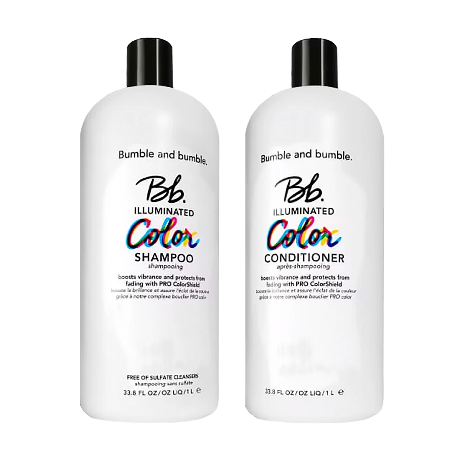 Introducing the Bumble and Bumble Illuminated Color Shampoo and Conditioner Liter Duo – a must-have set to keep your hair vibrant and nourished. This dynamic duo is designed to enhance and maintain the brilliance of color-treated hair.