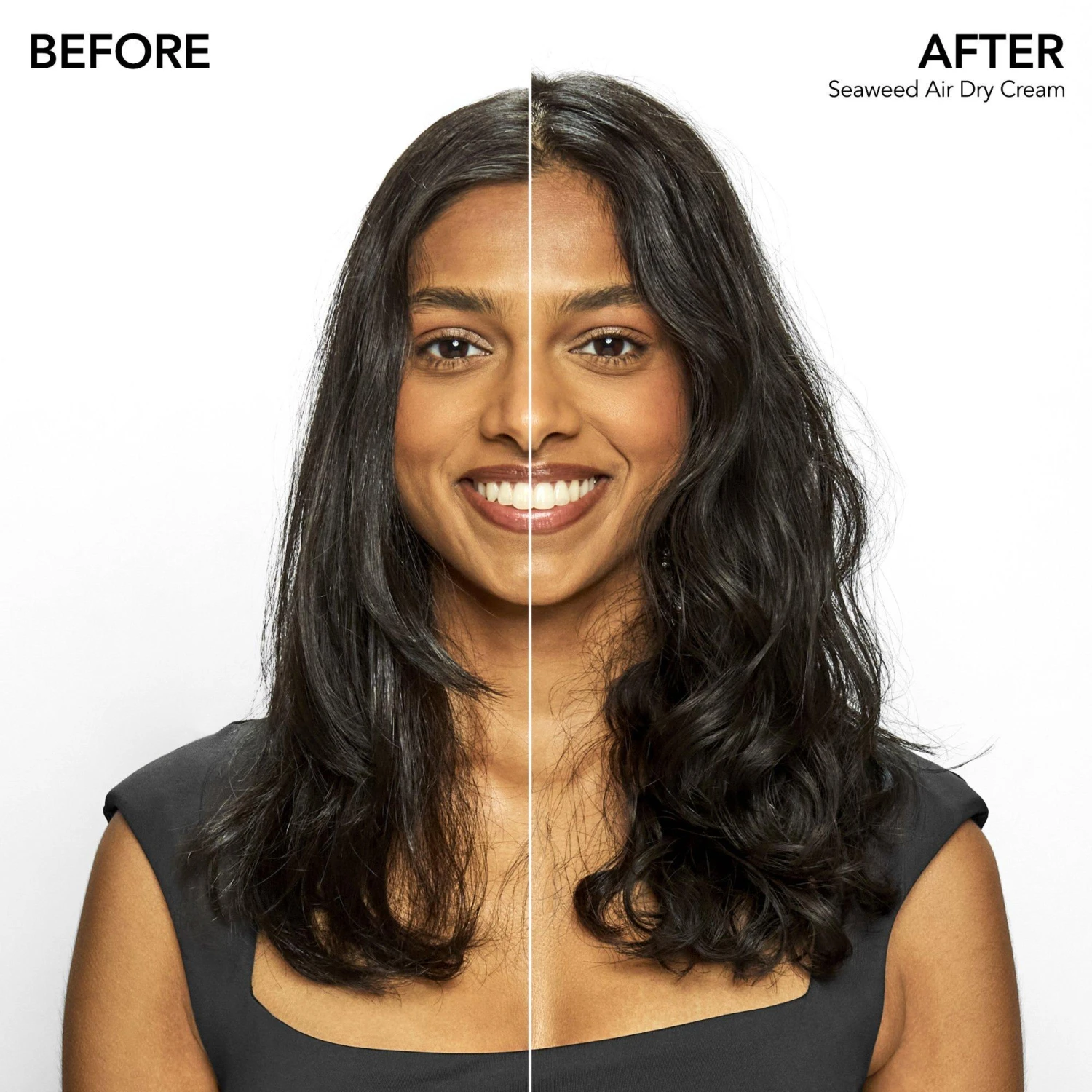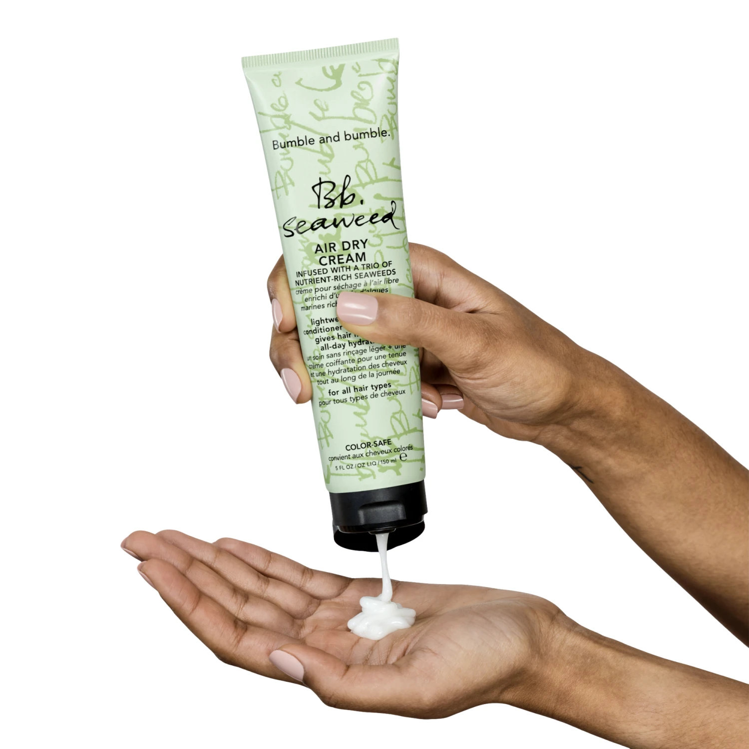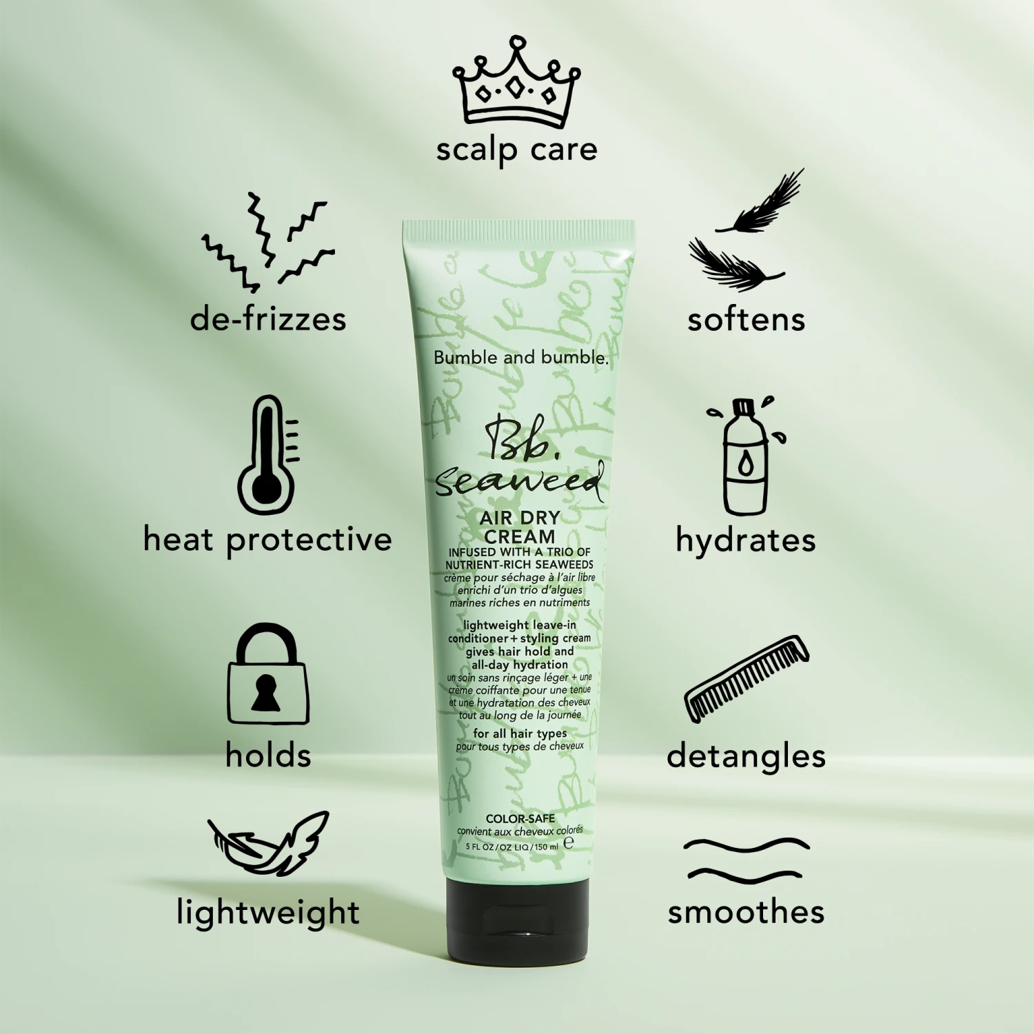 Bumble and bumble Seaweed Air Dry Cream. This dual leave in conditioner + styler instantly reduces frizz, nourishes scalp, and delivers all-day hold + hydration for stylish air-dried waves. Infused with a nutrient-rich trio of Royal Sugar Kelp, Pacific Sea Kelp, and Green Microalgae.