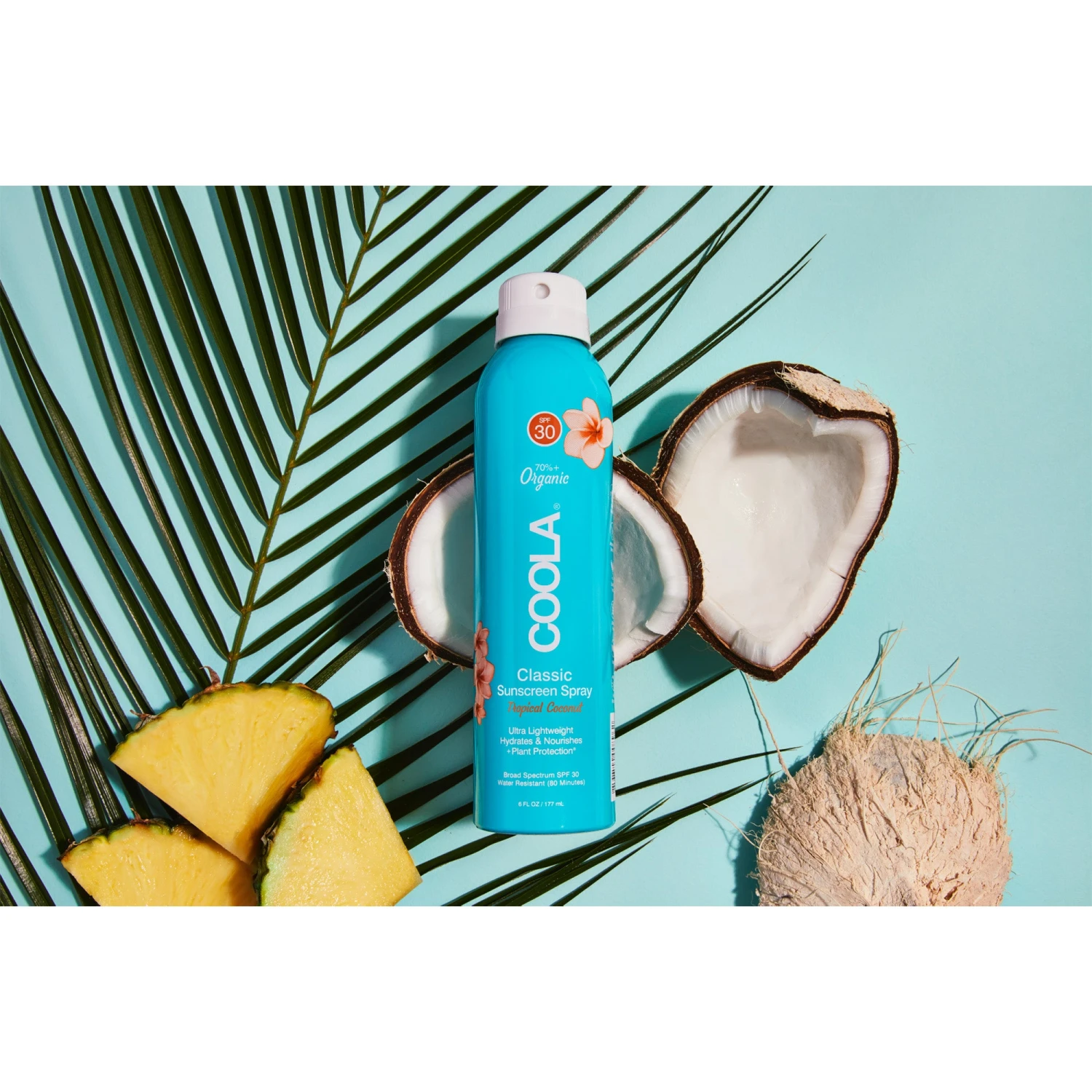 Introducing the Classic Body Organic Sunscreen Spray SPF 30 by COOLA Suncare, an organic, broad-spectrum SPF 30 continuous-spray sunscreen with antioxidants such as Cucumber, Algae, Strawberry, and Red Raspberry Seed Oil to help with UV protection. This sunscreen is sheer, water- and sweat- resistant, while still being lightweight and fast-absorbing. Algae and aloe Vera Extract helps to provide hydration while also soothing skin. It is Vegan, Non-GMO, Gluten-Free, Paraben-Free, making it a conscientious choice for both your skin and the environment.