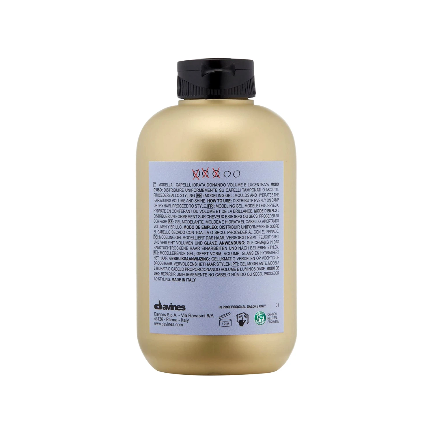 The Davines This is a Medium Hold Modeling Gel helps for structured and full-bodied wet looks. This Is A Medium Hold Modeling Gel helps give body and elasticity to curls, while also helping to eliminates frizz. Helps to holds sleek styles and protects against humidity. Davines products are formulated without parabens and SLES/SLS sulfates.