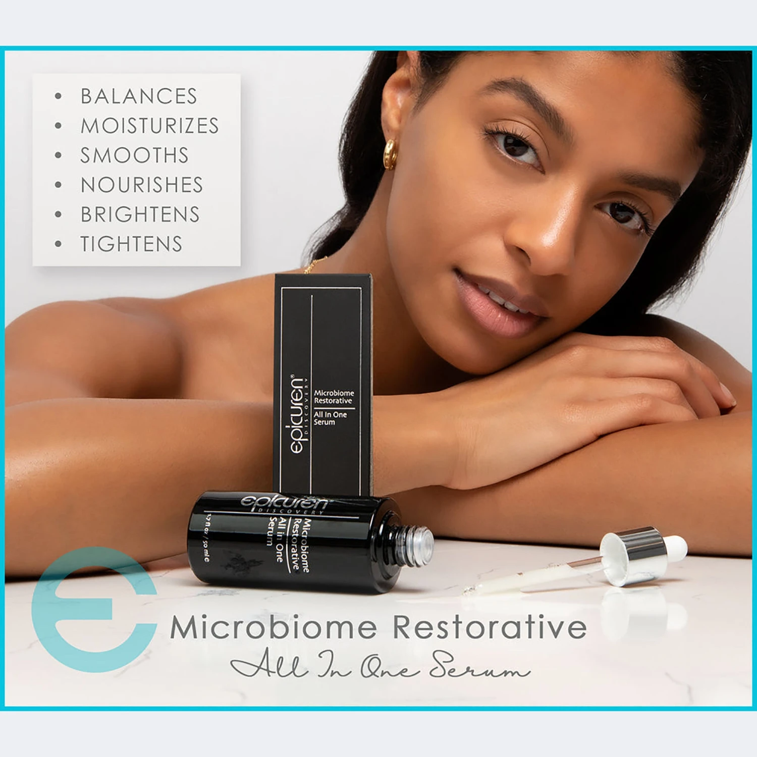Balancing the skin’s micro flora is key to healthy looking skin. Epicuren Discovery’s Microbiome Restorative All in One Serum incorporates, prebiotics, postbiotics, and probiotic technology along with powerful antioxidants, skin brighteners, and humectants to achieve the ultimate goal…the appearance of healthy, balanced skin. Recommended for | All skin types. Primary Concerns | Problematic, sensitive, compromised barrier, uneven skin tone.