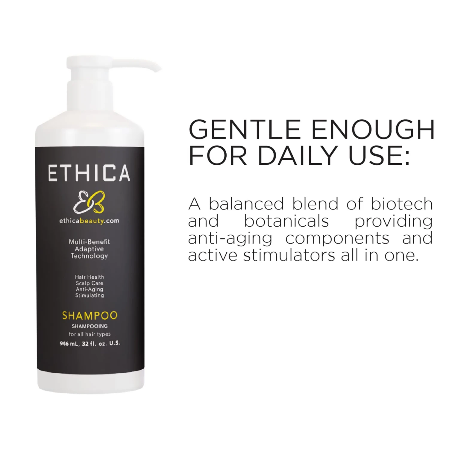A complete service for the hair, scalp and follicle. Ethica Beauty Stimulating Anti-Aging Daily Shampoo is a plant based shampoo with a balanced blend of biotech and botanicals. A concentrated formulation of amino acids, anti oxidants, plant extracts and essential oils protect existing hair. High efficacy formula for superior performance that’s gentle enough to use everyday. Plant Based. Cruelty Free. Sulphate, Paraben and Gluten Free.