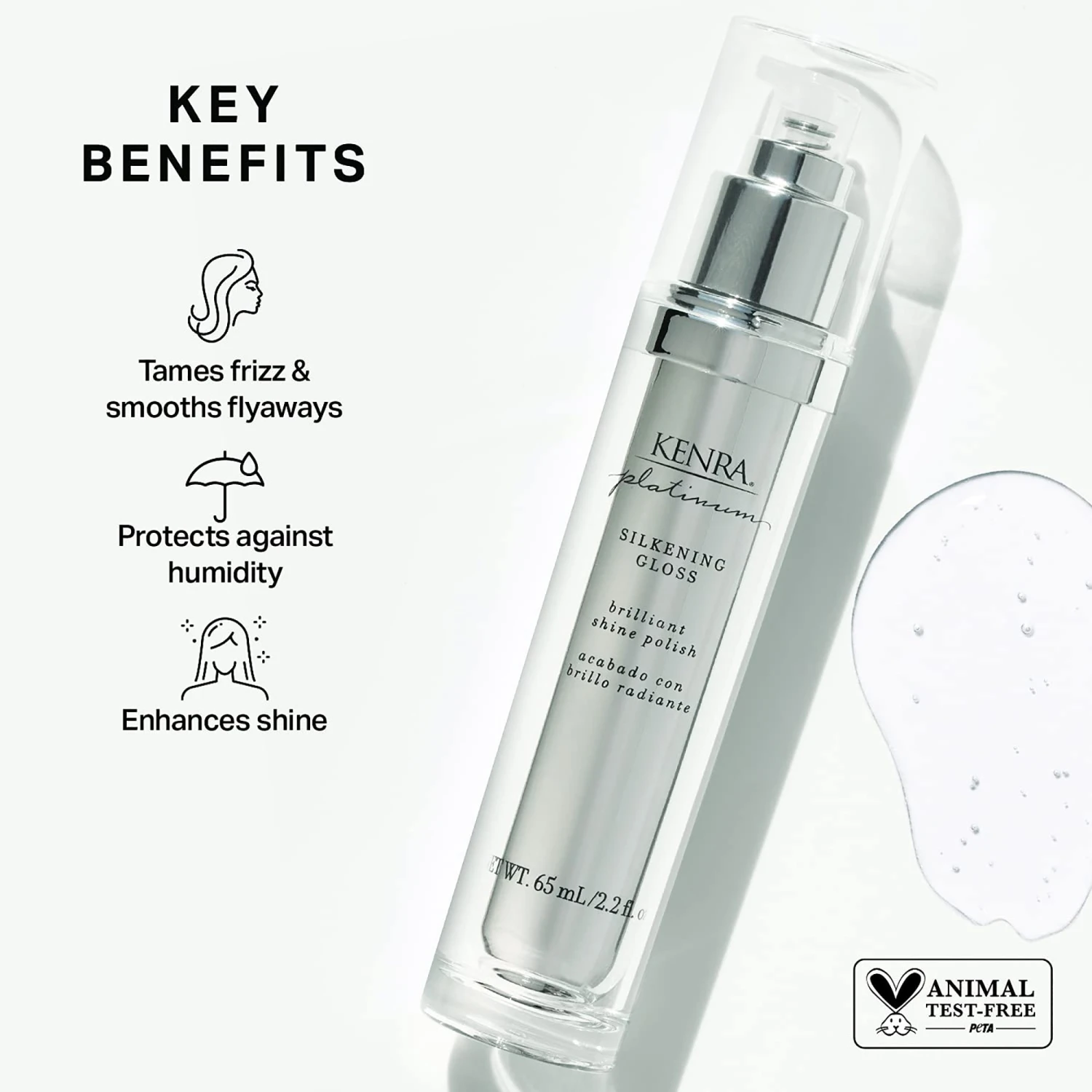 Kenra Platinum Silkening Gloss is a lightweight shine enhancing formula for silky, lustrous hair and skin. Taming anti-frizz hair product. Promotes optimum shine and condition. Protects against humidity. Smooths dry ends.