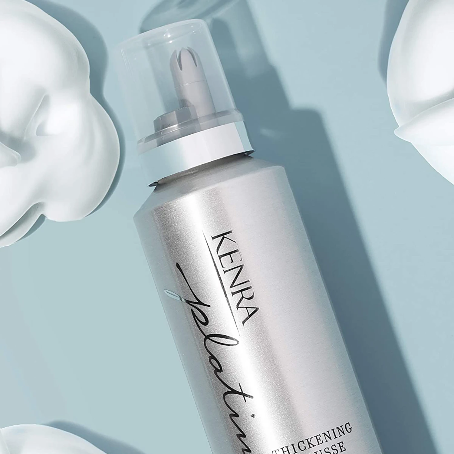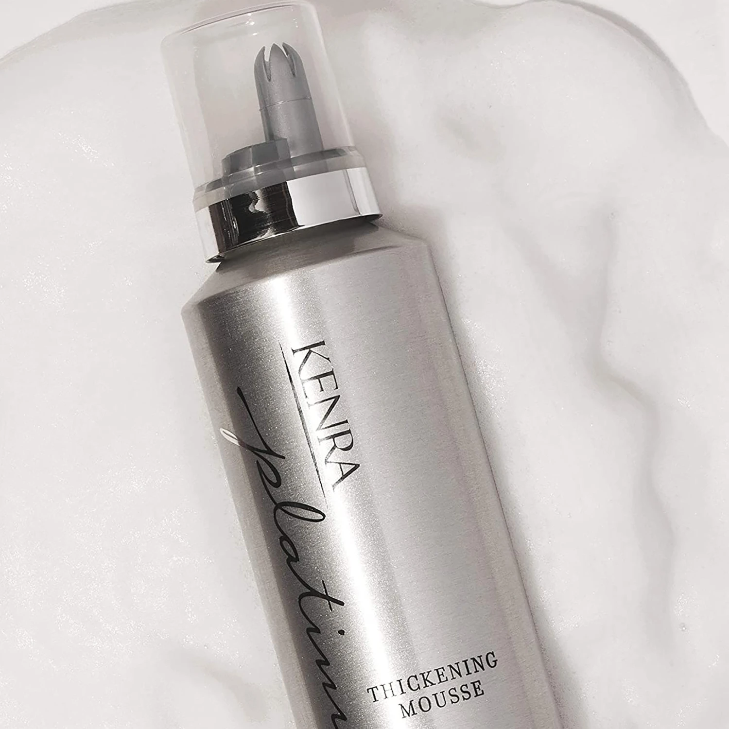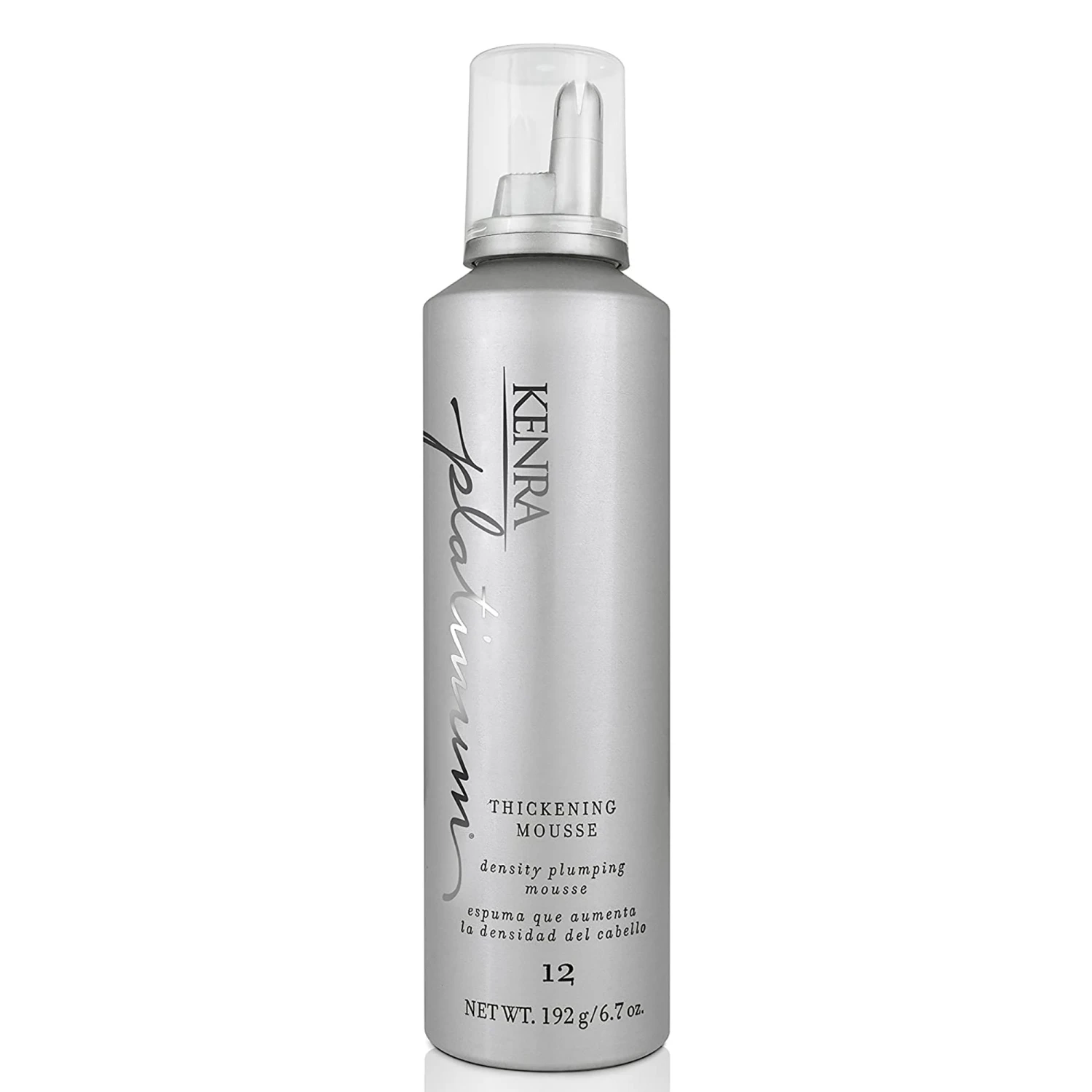 Kenra Platinum Thickening Mousse 12 plumps each strand of hair and adds fullness and body to achieve the appearance of thicker hair. This ultra-lightweight formulation resists humidity for up to 48 hours. Increases density of the hair shaft, Significantly increases body for up to 24 hours, Flexible, light hold lasts up to 24 hours, Non-flaking, brushable finish, Thermal protection.