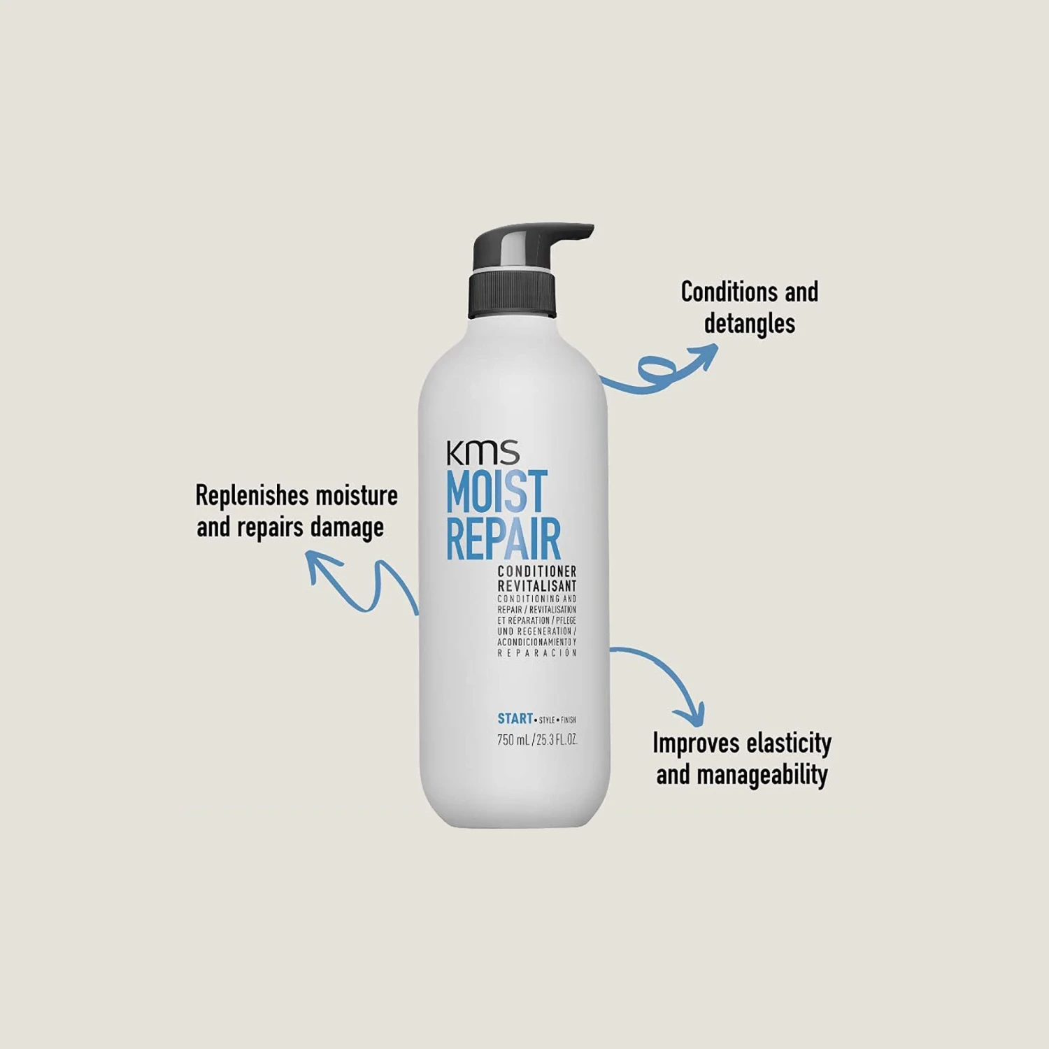 A scent of fruits, flowers, herbs and trees. KMS MOISTREPAIR Conditioner replenishes moisture and repairs damage while helping to restore the hair’s natural protective coating. Formulated with a AHA STRUCTURE COMPLEX that moisturizes and repairs to improves elasticity and manageability. Lactic Acid supports internal reconstruction and Polyquaternium-7 evens out the hair’s surface. 18-MEA helps to restore hair’s natural surface. Aloe Vera provides vitamins, minerals and amino acids, making it a great source for extra nourishment. Vanilla helps with the maintenance of healthy looking hair. The MOISTREPAIR Conditioner can remove residues of wax, when used before shampooing. This process is also called “reverse washing” and can be highly effective on fine hair that seeks lightweight moisture.