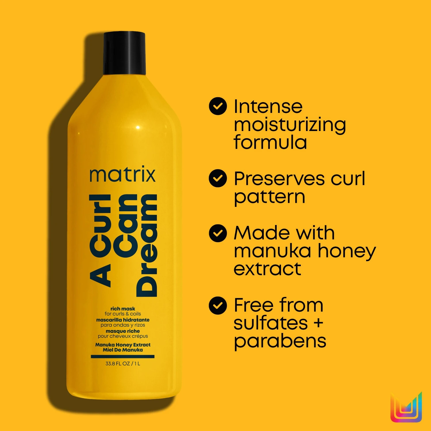 Matrix A Curl Can Dream Rich Mask for curls and coils, infused with Manuka honey extract. A deep hydrating mask that preserves the pattern of curls and coils. For curls and coils. Deeply hydrating. Preserves curl pattern.