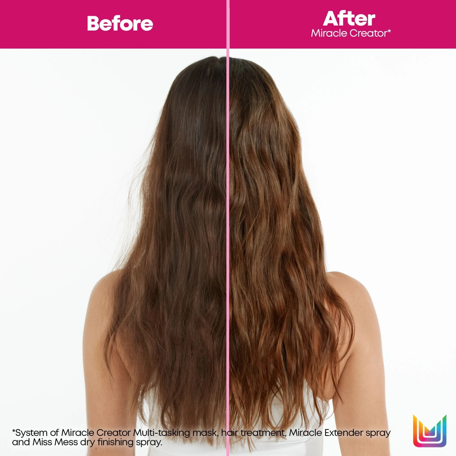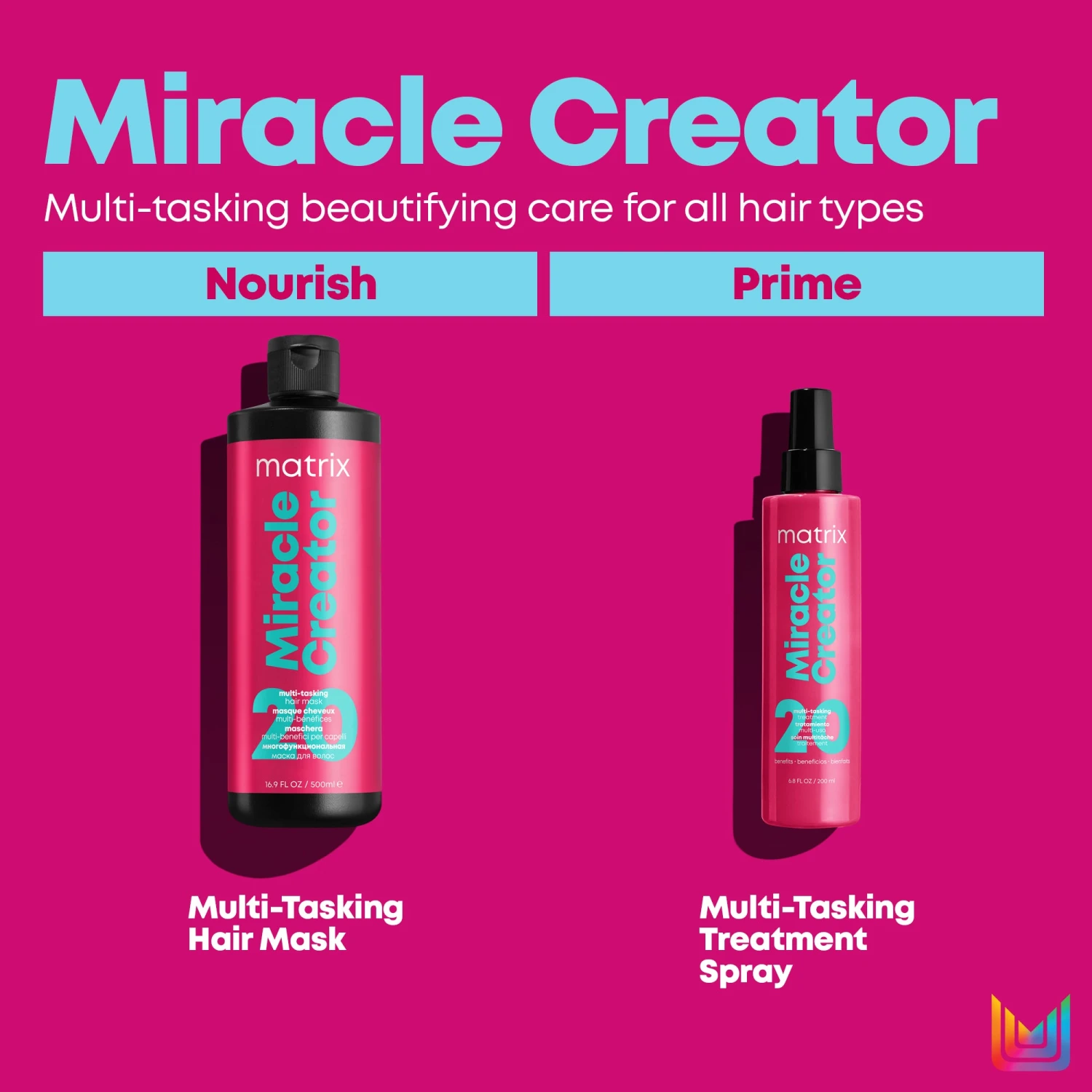 Matrix Miracle Creator Multi-Tasking Treatment has 20 beautifying benefits for your hair. Now in travel size. Helps prevent breakage from brushing, adds moisture, helps prevent heat damage, helps fight frizz. Leave-in conditioner that nourishes hair. Boosts shine. Smooths the cuticle and helps prevent breakage from brushing. Adds moisture. Heat protectant – prevents heat damage from hot styling tools. Anti-frizz reduction for a sleek finish. Evens out porosity. Minimizes hair damage and breakage. Reduces dryness. Conditions lightly, controls fly-aways. Prevents split ends and softens hair for an easier, quicker blow dry. Corrects roughness. Shields hair against external aggressors. Improves manageability and primes hair for styling. *Packaging may vary, Subject to availability*