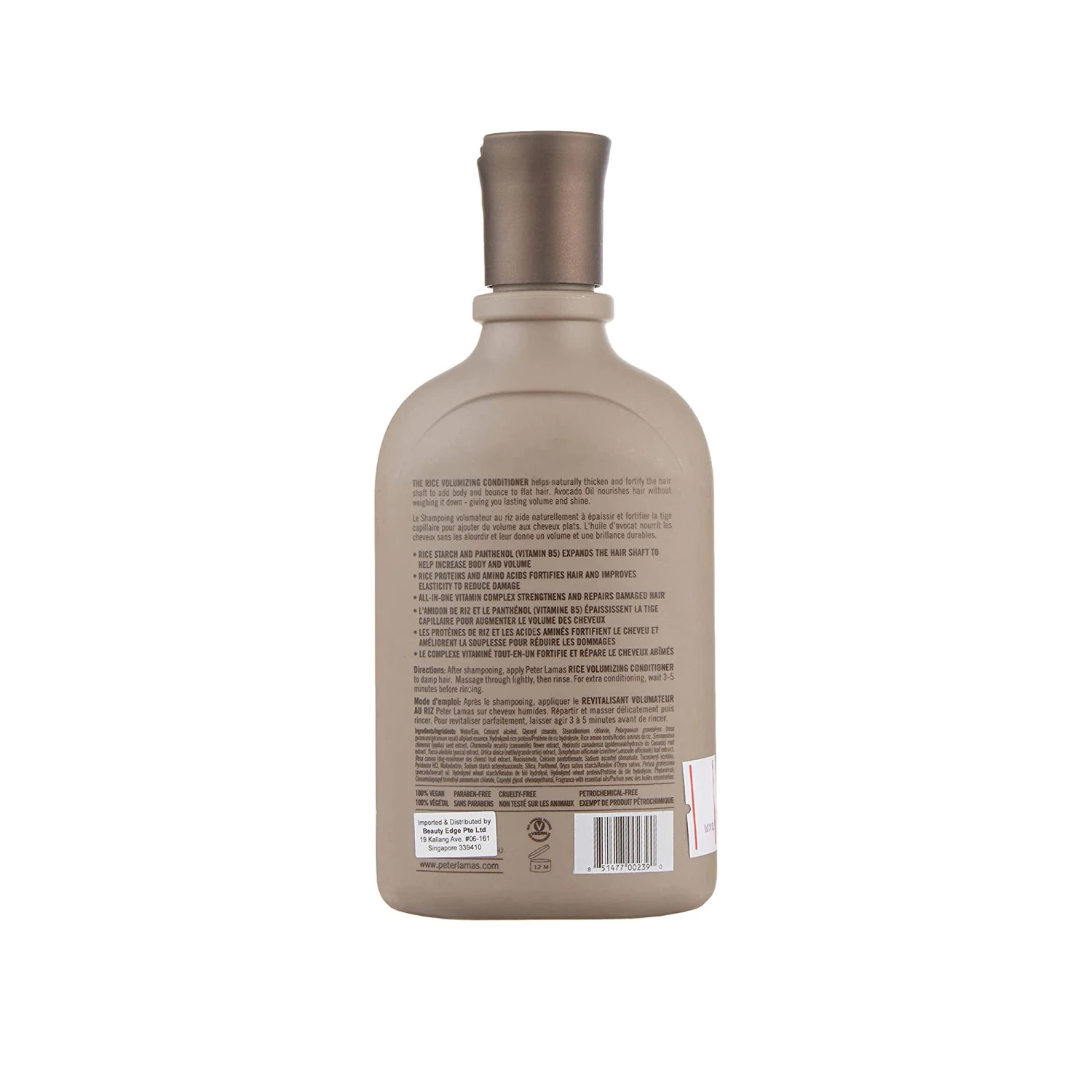 Help creates bounce and body while smoothing frizz with Peter Lamas Rice Protein Volumizing Conditioner, a nourishing conditioner for all hair types. This volumizing conditioner is infused with Rice proteins and B vitamins to help naturally build body and volume. Rice protein, starch, and amino acids help to retain moisture, add sheen, smooth hair cuticles, protect chemically-treated hair, and prevent breakage from brushing, curling, and straightening. Help transform fine, flat, limp, and lifeless-looking hair by expanding the diameter of each strand with this lightweight nourishing conditioner. Vegan, Sulfate-free, Paraben-free.