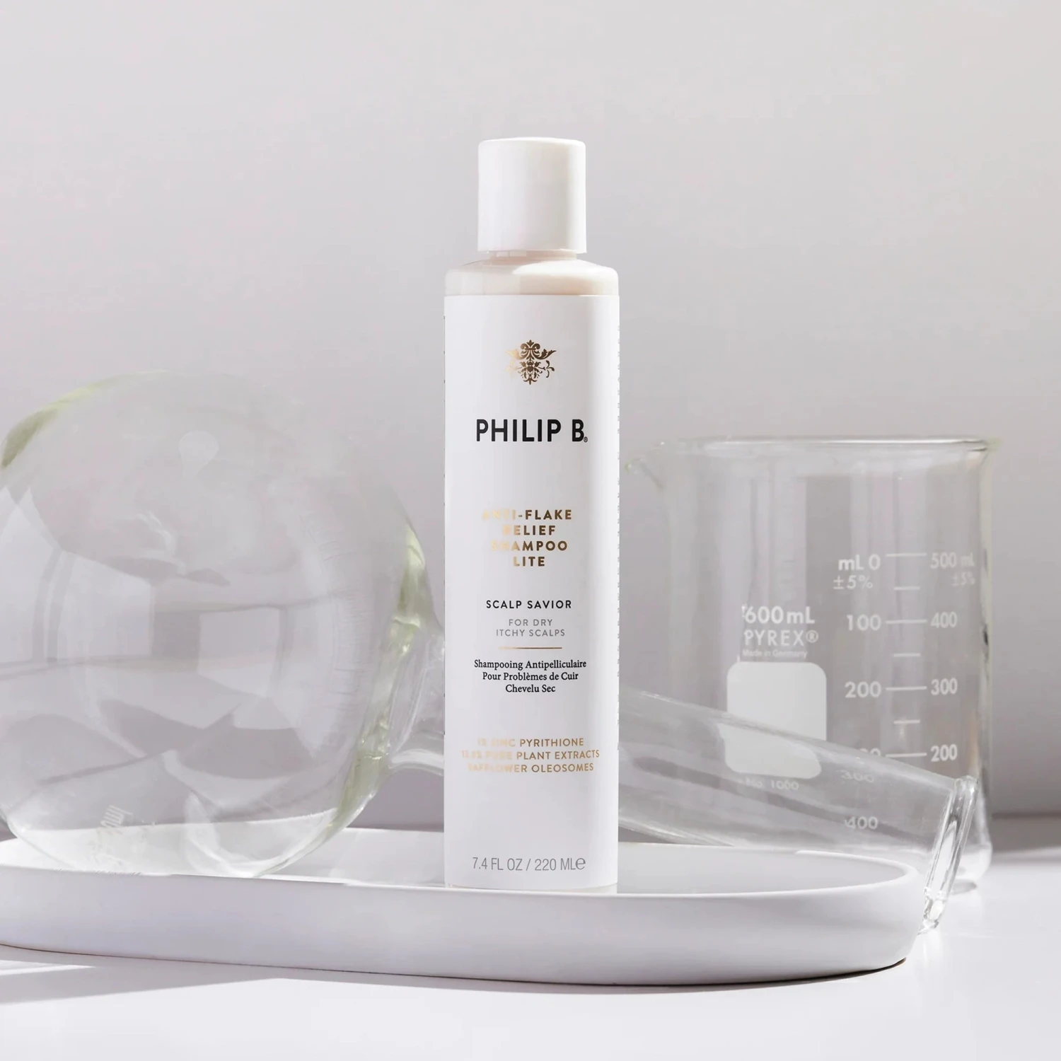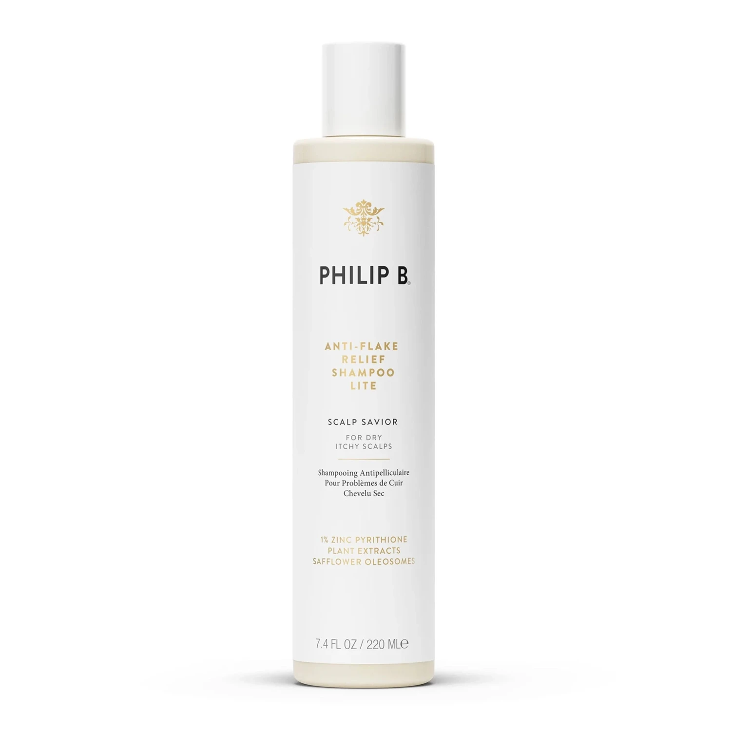 Help hair feel of thicker, fuller while also helping to prevent recurrence of itching and flaking with Philip B Anti-Flake Relief Shampoo Lite, a anti-flake relief shampoo for those with severe scalp issues. This treatment shampoo is infused with mix of botanicals, including Tea Tree Oil, Aloe Vera, Sage, Juniper, and Chamomile Extracts to help nourish hair from the inside out. L-Amino acid complex helps to strengthen, while time-released Safflower Oleosomes help to leave hair looking glossy and manageable.