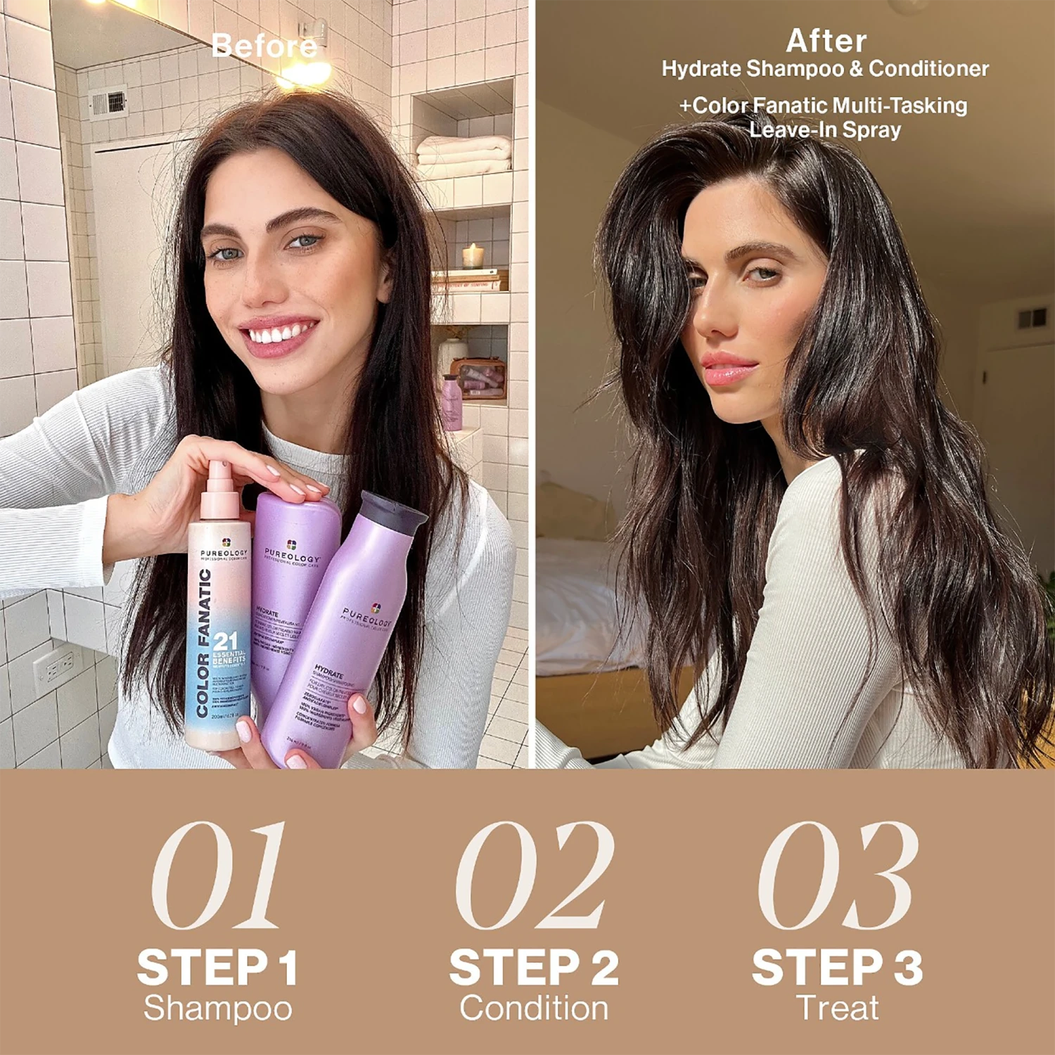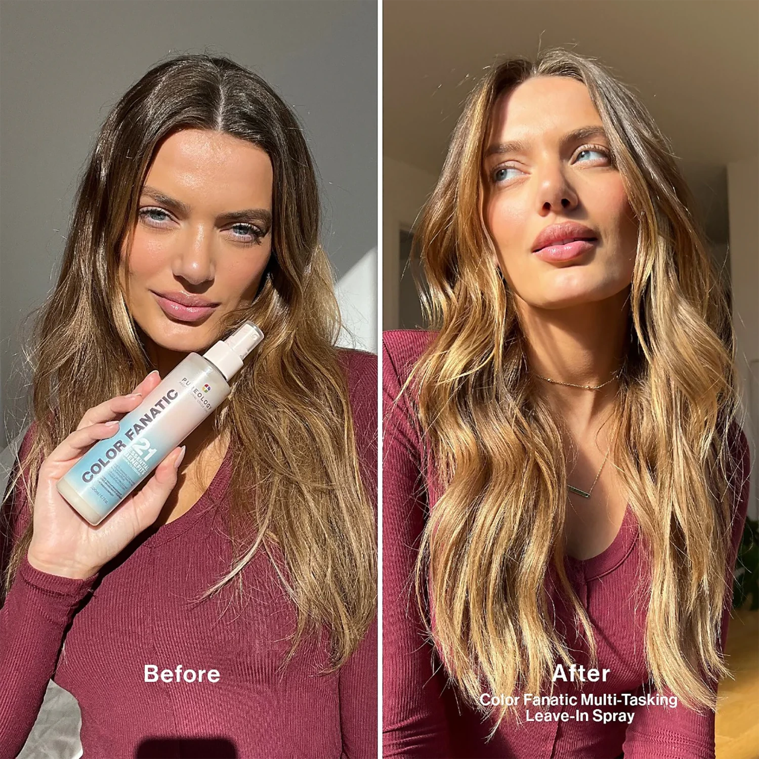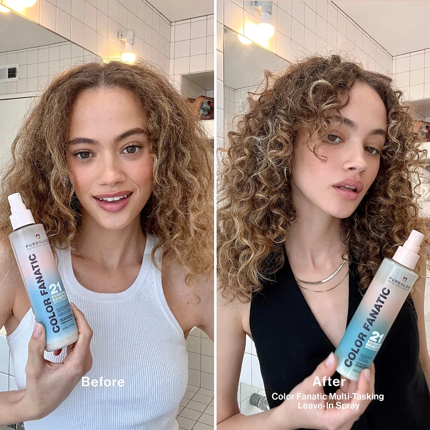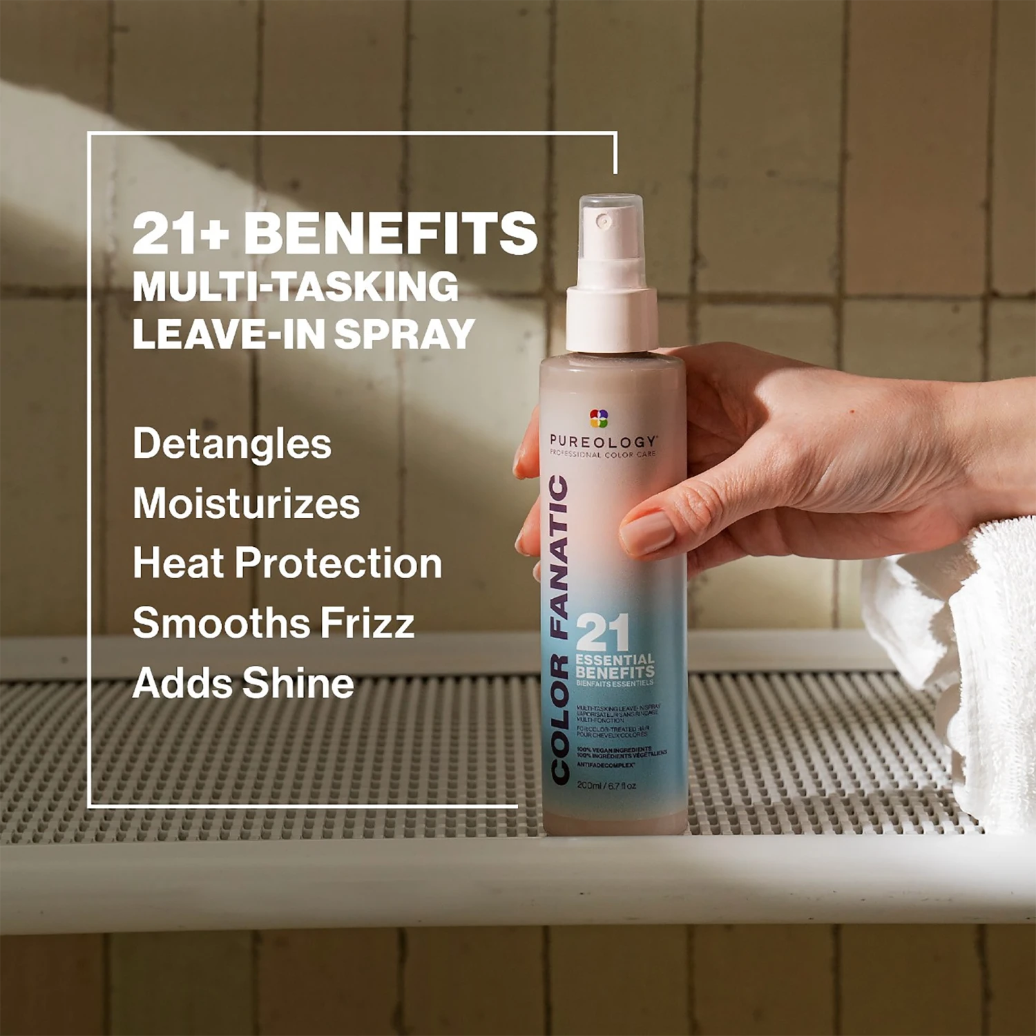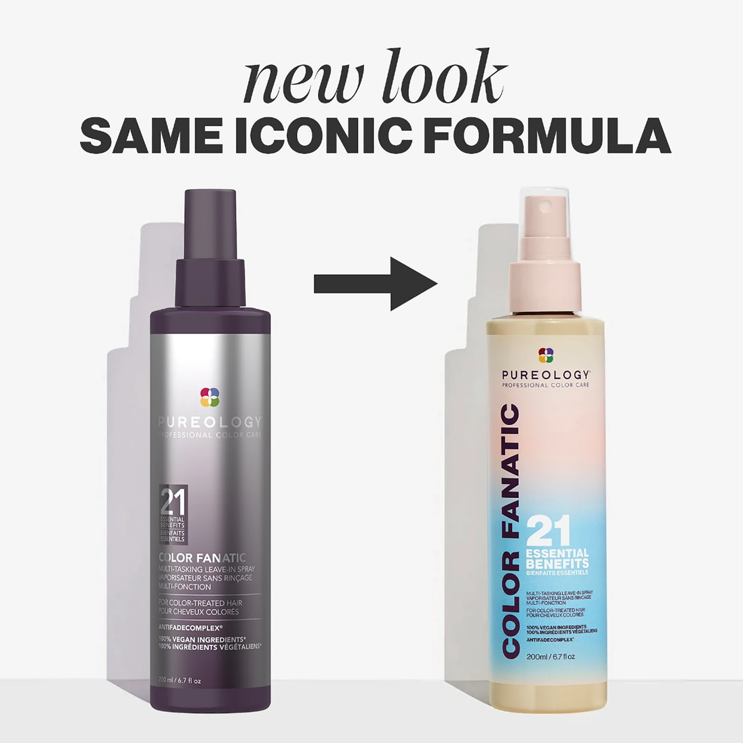 Your number one support system. As good as a personal assistant, this leave-in treatment gives you just what you need right when you need it. Prime, protect and perfect with a multi-tasking spray that uses 21 benefits to take care of all your hair’s needs. Moisturizing, strengthening, repairing and so much more, this formula gives you silky, shiny, enviable hair. Pureology Color Fanatic Multi-Tasking Leave-In Conditioner is a leave-in treatment that primes, detangles, preserves color vibrancy, protects from heat damage up to 450° F, and adds shine from root to tip. 100% Vegan! *Packaging May Vary, Subject to availability**