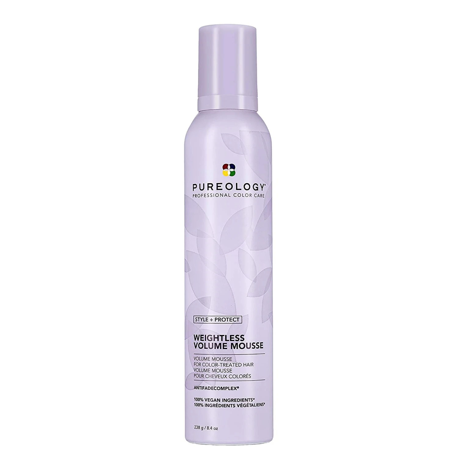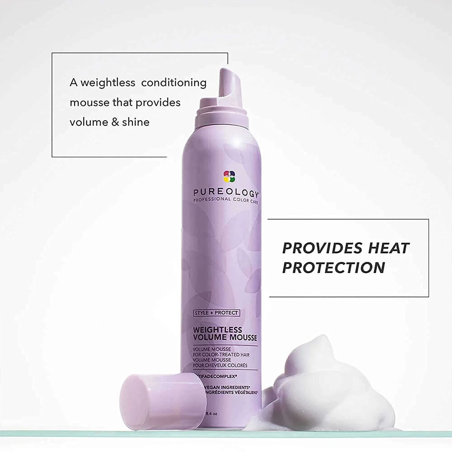 This mousse includes a signature aromatherapy blend of tuberose, almond milk, and cedarwood and a patented Antifade Complex to protect color vibrancy and ensure lasting color payoff. It also includes sunflower seed, a UV filter, and vitamin E to fight color-depleting environmental effects while ensuring lasting shine. Pureology Weightless Volume Mousse provides weightless volume, heat protection, and shine to flat, color-treated hair with key ingredient Xylose and a signature aromatherapy blend of Tuberose, Almond Milk, and Cedarwood. Sunflower Seed, a UV Filter, and Vitamin E fight color-depleting environmental effects while ensuring lasting shine. Our dual-benefit formulas provide color protection and customized care to address individual hair needs. Mousse add volume, shine and protects color-treated hair from color fade, heat damage and environmental stressors, Vegan Formula, Aromatherapy blend of Tuberose, Almond Milk, and Cedarwood.