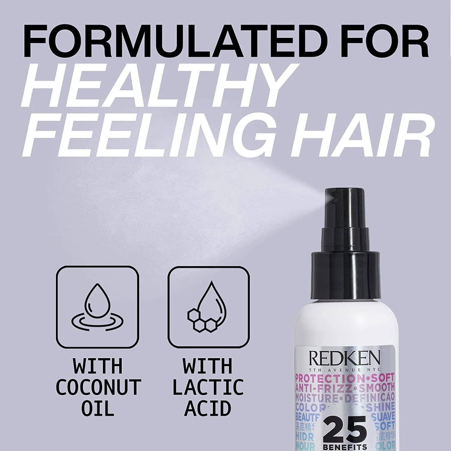 Redken One United is a multi-benefit all-in-one treatment and leave in conditioner. This professional product helps protect against hair breakage, primes hair for styling, offers anti-frizz protection, and is safe for color treated hair. For all hair types and textures. Offers 25 benefits that increase manageability, protect against hair damage and promote the beauty of your hair. Sulfate-free, paraben-free and free of heavy-waxes for lightweight, instant results. Can be used as both a leave-in conditioner and rinse-out hair treatment. Conditions, nourishes, detangles, anti-frizz. Provides heat protection. Improves manageability. Primes hair for styling. Reduces dryness. Helps even out porous hair. Provides Instant Results. Helps prevent hair breakage. Adds shine. Anti-static. Helps prevent split ends. Helps seal in hair cuticle. Safe for color-treated hair and highlighted hair. Helps shield against external aggressors. Gives a silky touch. Adds smoothness. Controls fly-aways. Makes blow-drying easier. Style refresher.