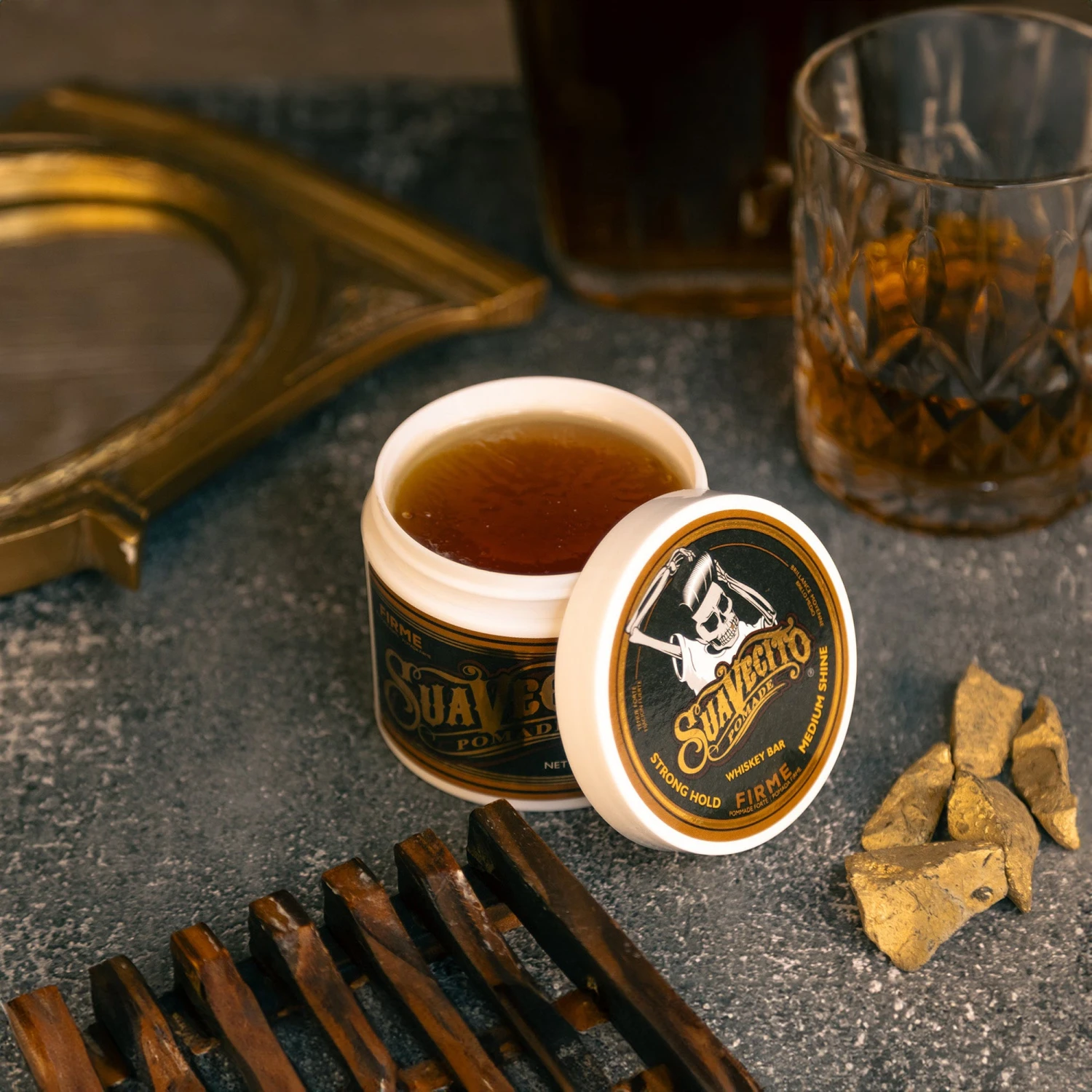 Introducing the Suavecito Firme (Strong) Hold Pomade in the tantalizing Whiskey Bar scent. This premium pomade combines the unbeatable hold of our Firme Hold formula with a deliciously distinct whiskey aroma, creating a grooming experience unlike any other.