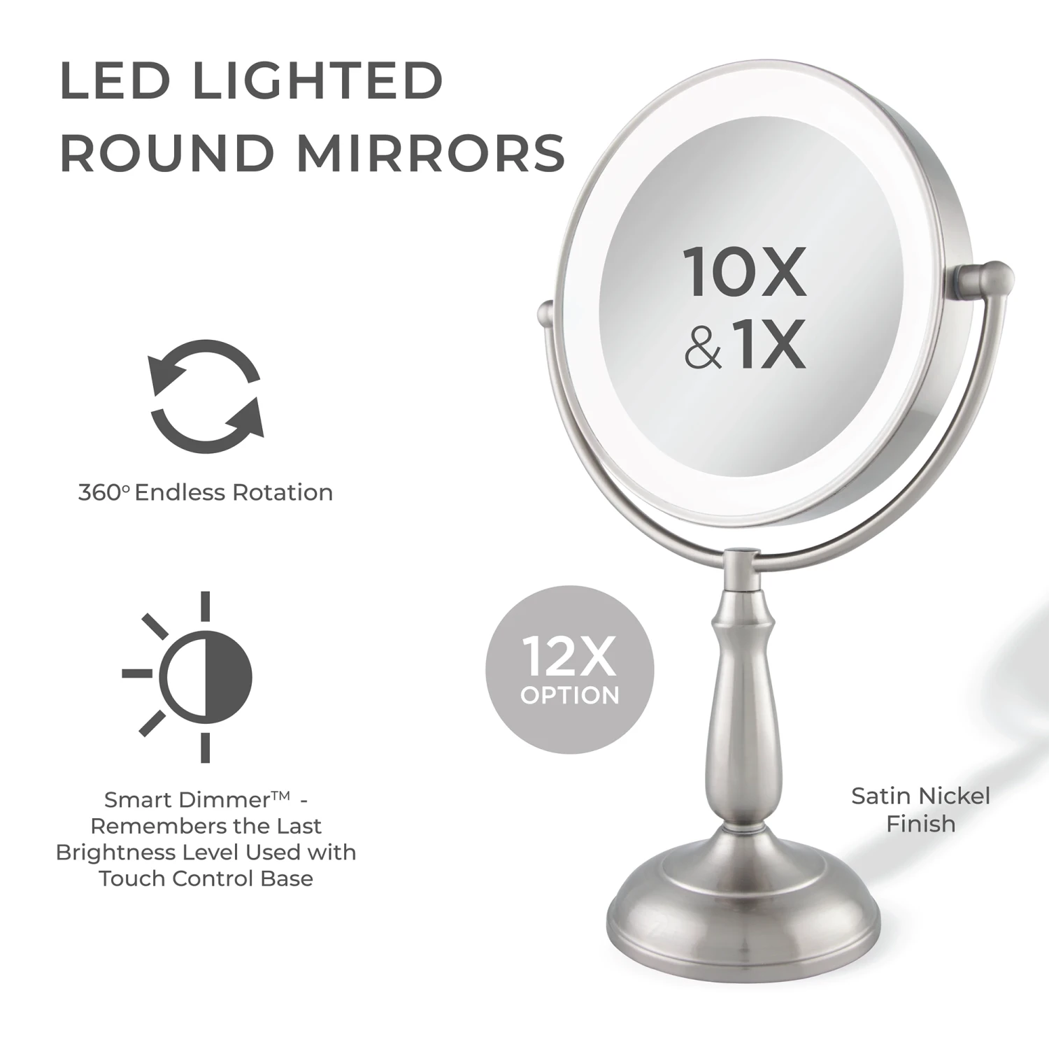 Energy-Saving LED Lighting Consumes up to 70% Less Electricity than Regular Bulbs Dimmable Touch Technology Dual-Sided 10X and 1X Magnification Endless Rotation – Mirror Head Swivels 360° .