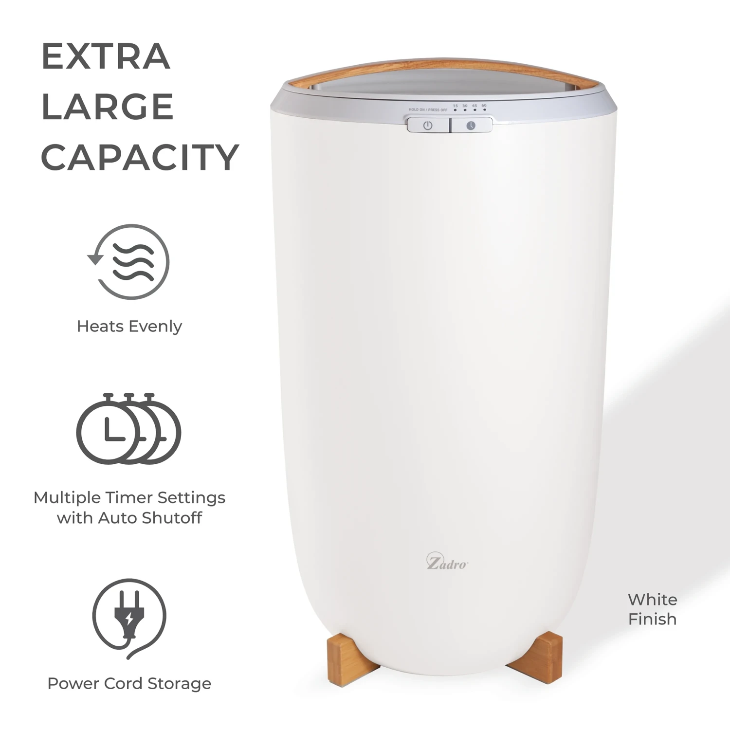 Everyday is a spa day with this oversized bucket style towel warmer. Stay toasty on cold mornings, dry off after a long bath or shower, or beat chilly mornings in luxurious warmth. Available in a modern white finish with natural bamboo accents, this extra large towel warmer accommodates up to two 40’’ x 70’’ bath towels, robes, or your favorite throw blanket. Auto shut off feature ensures safety, with four timer settings to choose from (15, 30, 45 or 60 minutes). A single temperature setting provides the optimal heat every time. Lightweight and easy to carry, this freestanding towel warmer can be placed anywhere in the home. The handy built-in cord storage in the base keeps the extra-long power cord completely hidden when not in use, while the slim profile allows for easy storage in a closet or underneath a bathroom countertop.