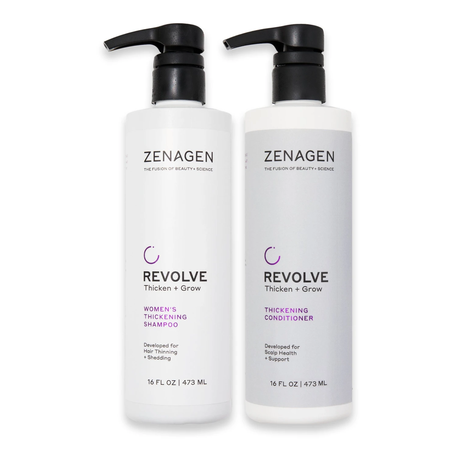 Zenagen’s Revolve Treatment for Women and Conditioner is now available in a new 16oz duo set that gives you more of our award-winning hair loss fighting products, with an even better value than before! Powered by a green tea delivery system and proprietary blend of nutraceutical ingredients, Revolve effectively targets hair loss the natural way without harsh chemicals and creates a healthy scalp to grow thicker, fuller hair.